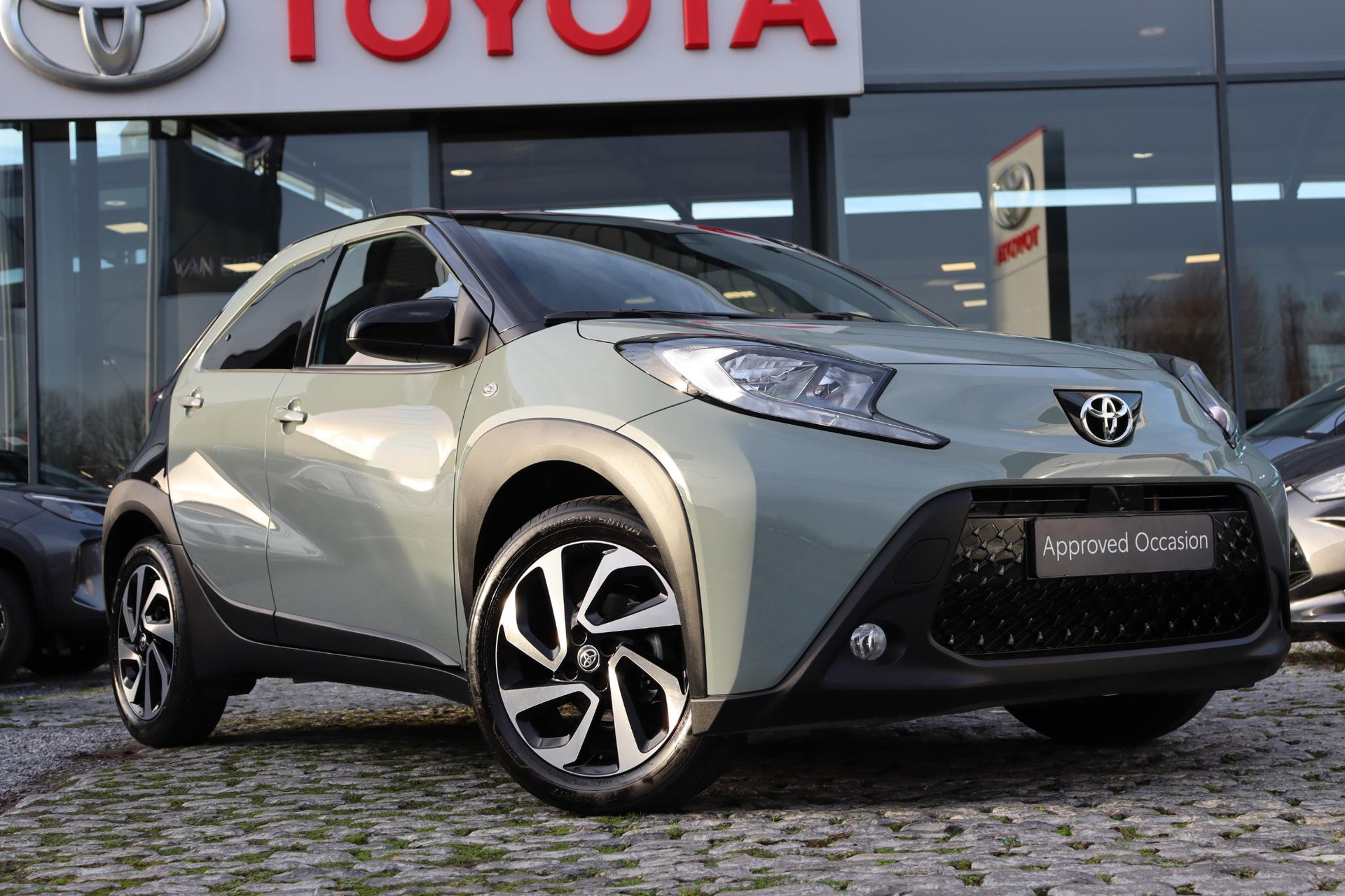 De Toyota Aygo X 1.0 handgeschakeld Pulse uitvoering in de prachtige kleur Tarragon Green met een Zwart dak. Bij de Pulse uitvoering krijgt u veel opties en extra's zoals: Stoelverwarming, Achteruitrijcamera, Apple-carplay, Android-auto, Lichtmetalen velgen, Privacy glas, Airconditioning, LED verlichting, Mistlampen, Bestuurderstoel in hoogte verstelbaar, Elektrisch verstelbare buitenspiegels, Elektrische ramen voor, DAB Audio, en nog veel meer!!