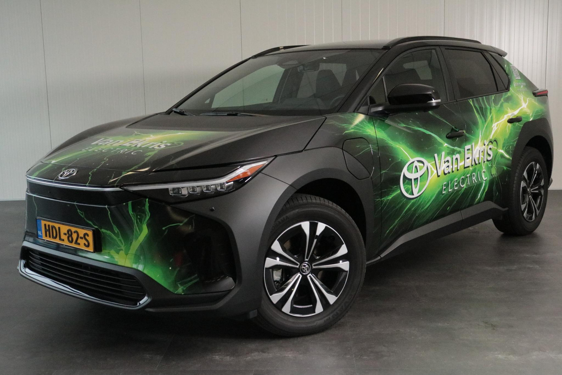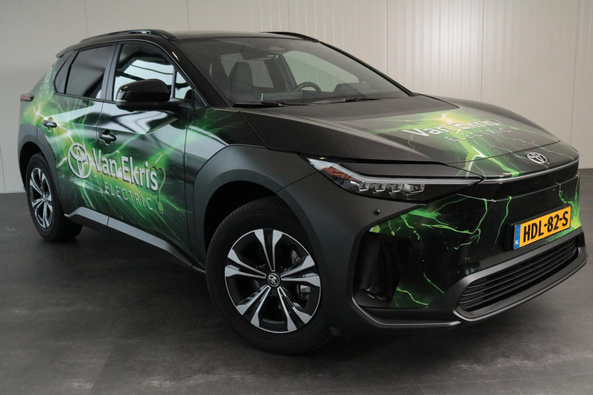 Zie je het al voor je, deze opvallend gewrapte bZ4X met jouw bedrijfslogo erop? Nu staan er uiteraard Van Ekris logo's op maar bij aanschaf kunnen we jouw logo ook laten plaatsen. De volledige wrap blijft dan zitten en maak je van deze bZ4X een rijdende reclame zuil voor jouw bedrijf!